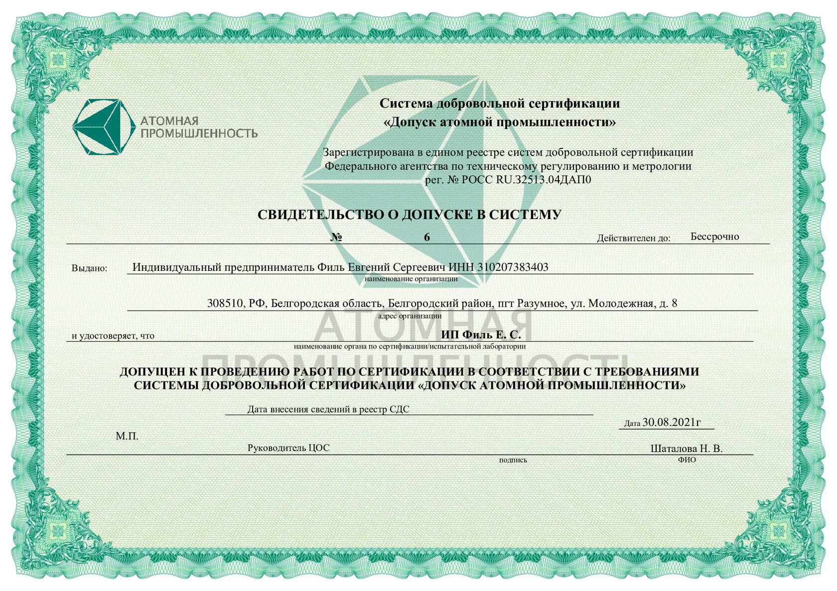 Сертификат СДС «Допуск атомной промышленности» - свидетельствует о качестве оказываемых услуг в области атомной промышленности и квалификации поставщиков.
